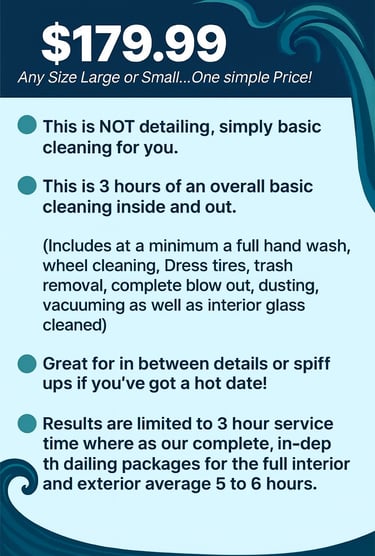 Island Mobile Detail’s Express Service is designed for quick, convenient upkeep between full details. This streamlined option focuses on essential exterior and interior touch-ups—perfect for busy schedules or regular maintenance. You’ll get a refreshed look and feel without the time commitment of a full detail, all delivered right to your location in Oak Harbor.
